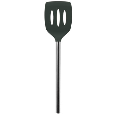 The Silicone Slotted Turner has a stain-resistant silicone head with elongated slots that prevent condensation. Tapered edges allow the turner to slide under food easily, while the stainless steel handle provides extra strength when lifting.