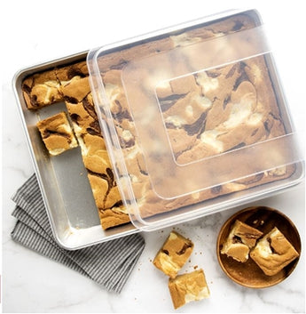 This generously sized sheet cake pan made of natural aluminum has a cover for storing and transporting all of your delicious creations. The lid is made of BPA- and Melamine-free polypropylene. Proudly made in the USA.