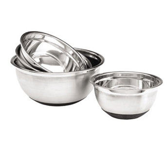Mixing Bowl, 3 qt., 2.2 mm thick, rubber base, polished interior, satin exterior, stainless steel.
