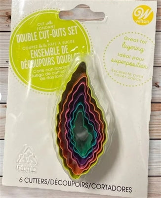 Cut with Wilton FONDANT DOUBLE CUT-OUTS SET. 6 cutters in set This durable cut-out set features a straight and crinkle side, allowing you to create unique layering effects with twice the cutting options.