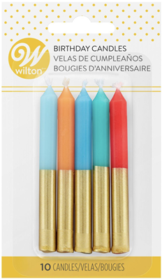 Wilton Blue, Orange, Red, and Green Gold Dipped Birthday Candles -- Set of 10