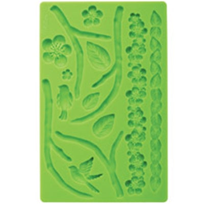 The detailed shapes in the mold let you add 3-D excitement to your cakes or cupcakes with fondant or gum paste accents. Dust the mold with cornstarch, press fondant into cavities, and shapes pop out easily and perfectly formed. The Nature mold features branches, flowers, birds and leaves in addition to two borders: flowers and leaves. Measures 7.8 in. x 5 in. x 0.4 in.