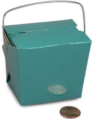 Colored paper wired handle carry boxes that come already set up. Made in the style of Chinese take-out boxes with a sturdy cardboard. These paper containers are not lined and are for dry items only.