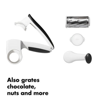 Now you can grate just the cheese you need and save the rest for later. The OXO Good Grips Seal & Store Rotary Grater provides a compartment for storing un-grated cheese right inside, with an interior silicone seal that ensures it won’t dry out. Grate with the cap on and window closed to collect cheese before serving, or slide the window open to grate the desired amount directly onto your dish. Bi-directional stainless steel blades can also shred chocolate and nuts, and the soft, comfortable, non-slip handle can be adjusted to accommodate both right- and left-handed users. Dishwasher safe.Features Large barrel and sharp bi-directional stainless steel blades for efficient grating Medium grating surface is ideal for hard cheeses, chocolate, nuts and more Cap collects grated cheese before serving; adjust window to pour desired quantity Adjustable handle accommodates right- and left-handed users Silicone seal keeps cheese fresh when stored in the refrigerator.