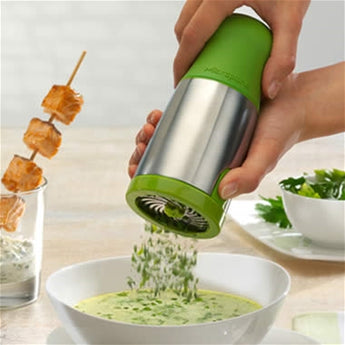 Prepping herbs by hand with a knife can be a long and difficult task. The Microplane Easy Prep Herb Mill cuts fresh herbs like parsley, dill, cilantro, sage and mint with hundreds of tiny scissors without bruising or blemishing. Holds a generous supply of herbs in a large body and can comfortably sit on your dining table! Learn more about selecting, storing, and using fresh herbs.