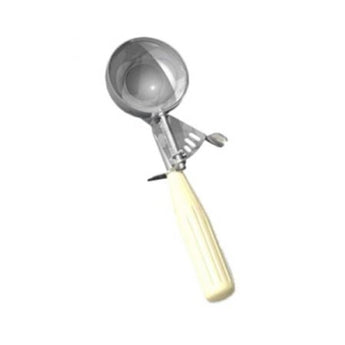 Crestware's #10 Ivory Handle Disher features stainless steel construction with a thumb triggered sweeper blade. For use in your right hand. Sizes are stamped on the bowl blade.