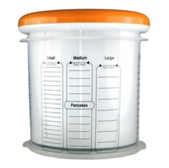 The KitchenArt batter Pro squeezes your batter with one easy movement, reduces dripping and eliminates mess. Use the easy to read measurement guidelines. Batter Pro comes equipped with a mini muffin guide, regular muffin guide and a small, medium and large pancake guide. Holds up to 2 3/4 cups of batter or one standard muffin mix.