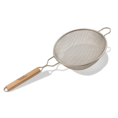Crestware 8" round, fine single mesh, flat wooden handle, stainless steel.