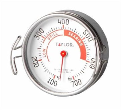 This unique thermometer can be placed on a grill, flat top or piece of cookware to track the ambient surface temperature. We find this helpful for monitoring ideal searing temperatures for the best browning on meats. The dial shows a temperature range from 100° to 700° Fahrenheit. The thermometer also includes a holder to help transport the hot device with tongs or other kitchen utensil after use.