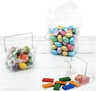 Beautiful translucent plastic wired handle carry boxes that come already set up. Made in the style of Chinese take-out boxes with a sturdy plastic.