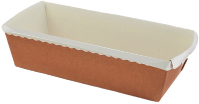 This loaf mold is a free-standing paper baking mold that features a white PET-Laminated interior with a terra cotta exterior. The PET-Laminated interior allows for easy release. Oven safe in temperatures up to 390° F. Place molds on baking sheet for additional support in the oven. Microwave and freezer safe. Grease resistant. Suggested uses: yeast bread|quick bread|crumb cake|bundt cake|pound cake|pasta.