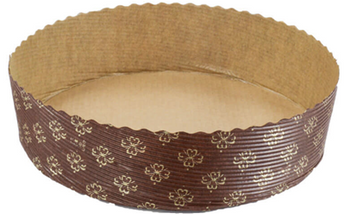 This is a round mid-height free-standing paper baking mold. Constructed with a corrugated sidewall and base. The mold has a brown background with a gold floret print overlay. Oven safe in temperatures up to 390° F. Place molds on baking sheet for additional support in the oven. Microwave and freezer safe. Grease and warp resistant. Suggested uses: cake|tart|pie.