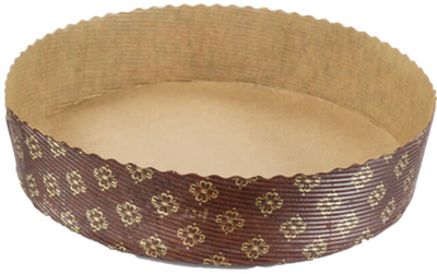 This is a round mid height style free-standing paper baking mold. Constructed with a corrugated sidewall and base. The mold has a brown background with a gold floret print overlay. Oven safe in temperatures up to 390° F. Place molds on baking sheet for additional support in the oven. Microwave and freezer safe. Grease and warp resistant. Suggested uses: cake|tart|pie.