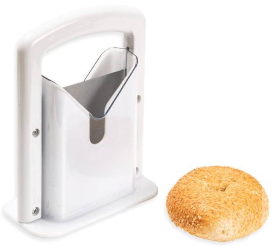 - HIC Kitchen Safe Grip Bagel Slicer: slices 2 equal halves in seconds; serrated stainless steel blade and guided shield create smooth, consistent results for everyday breakfasts, brunch buffets, entertaining, and a safer alternative to slicing by hand