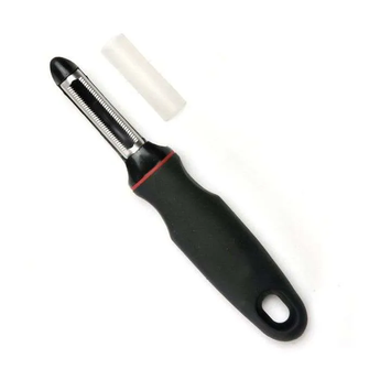 Stainless steel double-edged serrated blade allows back and forth peeling.