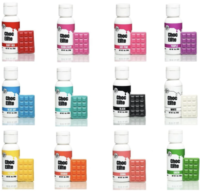 THESE VERY VIBRANT CHOCOLATE COLORS ARE THE EASIEST WAY TO ACHIEVE A BRIGHT VARIETY OF COLORS IN WHITE CHOCOLATE! CHOC ELITES ARE POTENT COLORS DESIGNED PRIMARILY TO SIMPLIFY TINTING AND CREATING SHADES OF WHITE CHOCOLATE. YOU CAN ACHIEVE A VAST ARRAY OF TONES AND SHADES FROM THESE CHOCOLATE COLORS AND ANY COMBINATION BY MIXING OTHER CHOC ELITES.